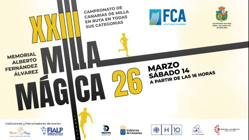 El Ayuntamiento de Breña Baja, la Federación Canaria de Atletismo (FCA) y la Federación Insular de Atletismo de La Palma organizan para el sábado 14 de marzo a las 16 hs en Los Cancajos, la XXIII Milla Urbana “Breña Baja Mágica 2026”, Campeonato de Canarias (en todas sus categorías) y Memorial "Alberto Fernández Álvarez". Colabora el Gobierno de Canarias, Cabildo Insular de La Palma y otras entidades.