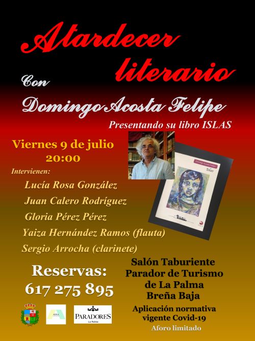El viernes 9 de julio, a las 20 hs, en el Parador de Turismo de La Palma se celebra el IV Atardecer Literario, donde Domingo Acosta Felipe presentará su poemario "Islas". También se contara con la participación de los poetas Lucía Rosa González y Juan Calero Rodríguez, además de Gloria Pérez Pérez y los músicos Yaiza Hernández Ramos (flauta) y Sergio Arrocha (clarinete).
