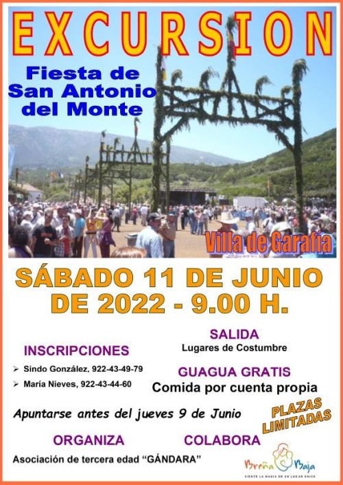 La Asociación de Tercera Edad “Gándara” de Breña Baja, poco a poco, va recuperando sus habituales actividades y de esta manera organiza para el sábado 11 de Junio la tradicional Excursión a la Fiesta de “San Antonio del Monte” del municipio de la Villa de Garafía. Cuenta con la colaboración del Ayuntamiento de Breña Baja.