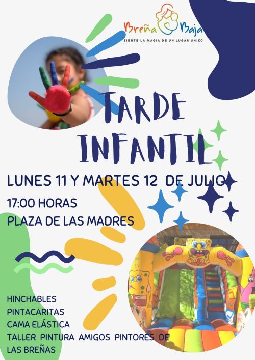 Lunes 11 de Julio, a las 17 hs, Tarde Infantil con hinchables, cama elástica y pintacaras a cargo de Tabayzú. También habrá talleres de manualidades y juegos por parte del proyecto de prevención de adicciones y los hábitos de vida saludable por parte del Ayuntamiento de Breña Baja a través de la asociación Mojo de Caña.