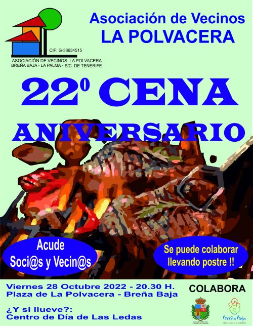 Con motivo del 22º Aniversario, la Asociación de Vecinos "La Polvacera" de Breña Baja, celebra su Cena-Aniversario el viernes 28 de octubre a partir de las 20.30 hs. en la Plaza de La Polvacera, donde están invitados/as todos/as los/as socios/as de la asociación y vecin@s del barrio. Se cuenta con la colaboración del Ayuntamiento de Breña Baja.