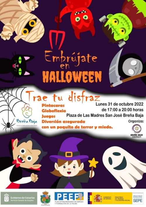 El lunes 31 de octubre de 17 a 20 hs, en la Plaza de Las Madres de San José el PEEF “Breña Baja Dinamiza” organiza “Embrújate en Halloween” con juegos pringosos y graciosos, música, pintacaras de miedito, globoflexia con patas, piñatas terroríficas,…. y llevate tu disfraz.