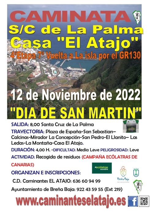 El C. D. de Caminantes "El Atajo" organiza para el sábado 12 de Noviembre una caminata medioambiental de recogida de residuos, conjuntamente con la Concejalía de Deportes del Ayuntamiento de Breña Baja dentro del Programa de Senderismo de Breña Baja, la caminata nº 788: “S/C de La Palma – Casa El Atajo (Breña Baja)”.