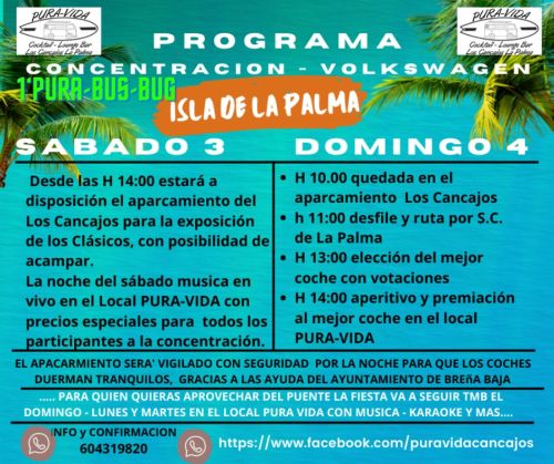 El fin de semana del 3 y 4 de diciembre en los aparcamientos de Los Cancajos (frente a Centro-Cancajos) habrá una Concentración de Volkswagen Clásicos (hasta el año 1990) que organiza el Lounge Bar “Pura Vida” con la colaboración del Ayuntamiento de Breña Baja.