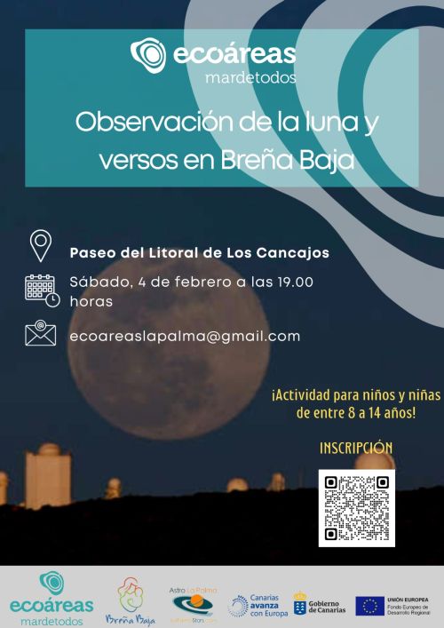 Dirigida a edades entre 8 y 14 años, el proyecto Ecoáreas Mardetodos de Los Cancajos organiza para el sábado 4 de febrero (víspera de luna llena), de 19 a 21 hs, en el Paseo del Litoral de Los Cancajos una actividad combinada de Observación de la Luna y Recital de Versos. Cuenta con la colaboración del Ayuntamiento de Breña Baja entre otras entidades. Inscripción gratuita y aforo limitado.