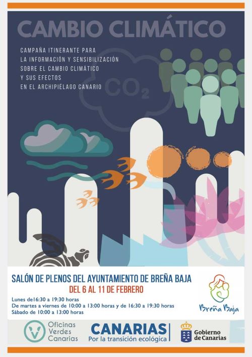 Del 6 al 11 de febrero en el salón de plenos del Ayuntamiento de Breña Baja tendrá lugar una Exposición sobre los Efectos del Cambio Climático en Canarias. Se trata de la segunda edición de la Campaña Itinerante de Concienciación Ciudadana que lleva a cabo la Consejería de Transición Ecológica, Lucha contra el Cambio Climático y Planificación Territorial del Gobierno de Canarias, a través de las Oficinas Verdes de Canarias. Contando con la colaboración del Ayuntamiento de Breña Baja para su difusión y promoción.