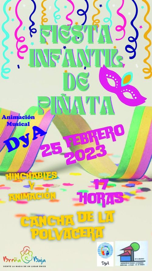 El sábado 25 de Febrero, 17.00 h, se celebra la tradicional Fiesta Infantil de “Piñata” en la Cancha Polideportiva de La Polvacera. El acto que está organizado por la Asociación de Vecinos de La Polvacera y el Ayuntamiento de Breña Baja, pretende que un año más, los niños y las niñas sean los protagonistas de una tarde de diversión y piñata carnavalesca pensada especialmente para ellos.