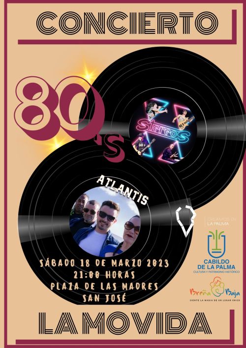 El sábado 18 de marzo a las 21 hs tendrá lugar el Concierto de “La Movida” (Años 80) en la Plaza de Las Madres de San José con la actuación de los grupos palmeros “Atlantis” y “Stereos”.