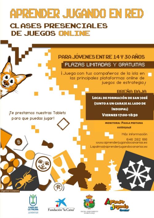 El Ayuntamiento de Breña Baja y Aprender Jugando La Palma han programado la siguiente edición de clases gratuitas presenciales de Juegos Online para jóvenes entre 14 y 30 años, en el Aula de Formación de San José (Rambla de los Poetas). Cuenta con la colaboración del Cabildo Insular de La Palma y la Fundación La Caixa.