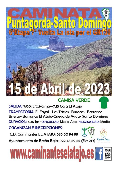El sábado 15 de abril, el C. D. de Caminantes "El Atajo" y la Concejalía de Deportes del Ayuntamiento de Breña Baja organizan, dentro del Programa de Senderismo de Breña Baja, la caminata nº 810 "Puntagorda - Santo Domingo" (municipio de Garafía).