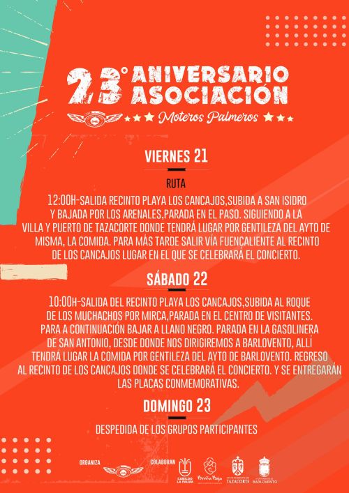 El fin de semana del 21 al 23 de abril la Asociación Club “Moteros Palmeros” celebran su XXIII Aniversario con varios actos en la zona del Charco del Lino de Los Cancajos, donde se congregará a moteros de todas las islas, con actividades como rutas por la isla, comidas y conciertos.