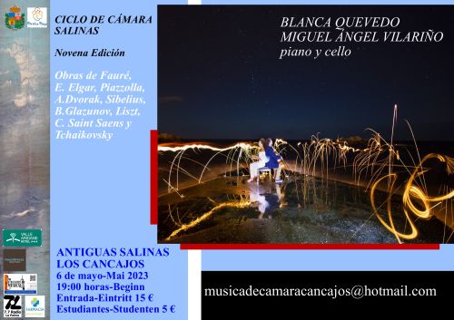 El octavo concierto del Ciclo de Cámara Salinas en su Novena Edición, tendrá lugar el sábado 6 de mayo en Las Salinas de Los Cancajos, 19 hs, con un concierto de piano y cello por Blanca Quevedo y Miguel Ángel Vilariño respectivamente.
