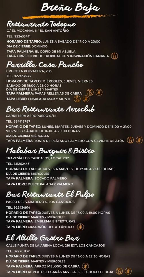 Breña Baja cuenta con la participación del Restaurante el Pulpo, Bar Restaurante Aeroclub, Restaurante Casa Pancho, Restaurante Todoque, Malabar Burguer & Bistro y el Altillo Gastro Bar con sugerentes y sabrosas tapas.