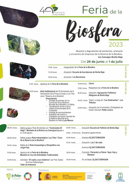 Del 26 de junio al 1 de julio en Los Cancajos, tendrá lugar los actos en conmemoración del 40 Aniversario de la Declaración de la «Finca del Canal y Los Tilos» como Reserva de la Biosfera. Se cuenta, entre otras entidades, con la colaboración del Ayuntamiento de Breña Baja.