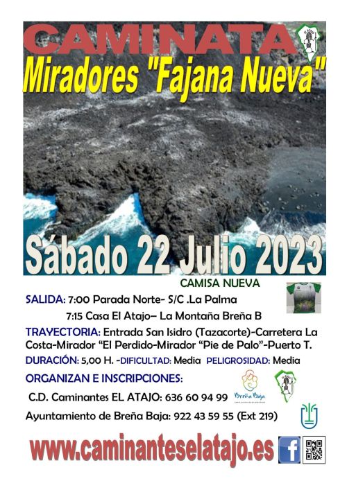 El sábado 22 de julio, el C. D. de Caminantes "El Atajo" y la Concejalía de Deportes del Ayuntamiento de Breña Baja organizan, dentro del Programa de Senderismo de Breña Baja, la caminata nº 824 Miradores de la "Fajana Nueva", ocasionada por el nuevo Volcán de Tajogaite (2021) en el municipio de la Villa y Puerto de Tazacorte.