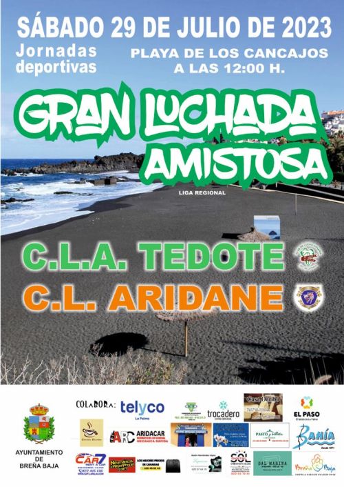 El sábado 29 de julio, a las 12 hs, en la zonaq deportiva de la Playa de Los Cancajos tendrá lugar una Gran Luchada Amistosa entre los clubes palmeros de lucha canaria Aridane y Aurita Tedote. Entrada libre.