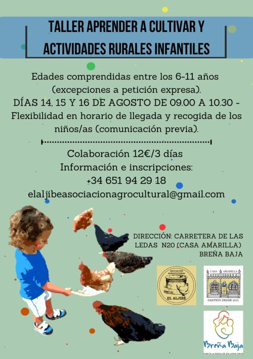 La Asociación Agrocultural "El Aljibe" organiza del 14 al 16 de Agosto un Taller de Aprender a Cultivar y Actividades Rurales Infantiles en la Casa Amarilla de Las Ledas para edades de 6 a 11 años. Cuenta con la colaboración del Ayuntamiento de Breña Baja.