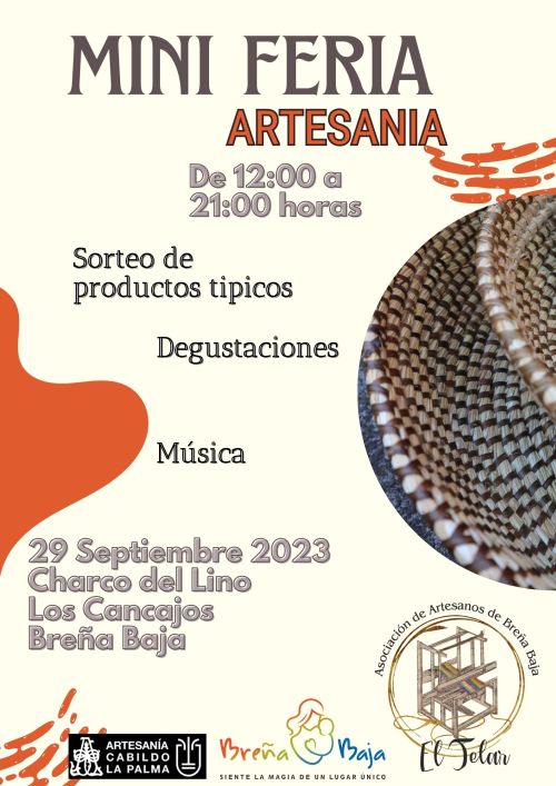 El viernes 29 de Septiembre de 12 a 21 hs en el paseo del Charco del Lino (Los Cancajos) la Asociación de Artesanos "El Telar" de Breña Baja y la Concejalía de Artesanía del Ayuntamiento de Breña Baja organizan la Mini Feria de Artesanía del mes de Septiembre. Con la colaboración de la Consejería de Artesanía del Cabildo Insular de La Palma.