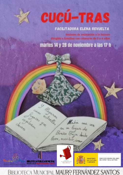 - “Cucú-Tras” (0-4 años), para los días martes 14 y 28 de noviembre a las 17 hs y facilitado y dinamizado por Elena Revuelta. Una bebeteca de 0 a 4 años, y para sus madres y padres. Un espacio de diversión con libros, poemas, canciones, ilustraciones…Un lugar para mostrar y descubrir estrategias a los padres igual que el propio “Cucú-tras” nos hace escondernos y aparecer de forma mágica detrás de nuestras manos. Para jugar, contar y cantar.