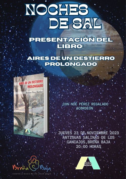 El jueves 23 de noviembre, a las 20 h, en las Antiguas Salinas de Los Cancajos, el escritor y traductor Mariano Flores Martínez presentará su libro «Aires de un destierro prolongado» en el marco de las Noches de Sal. Noé Pérez Regalado amenizará el evento con su acordeón.