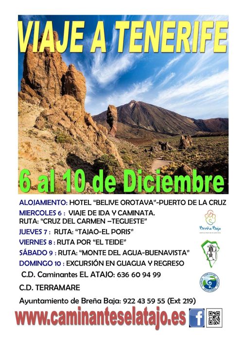 Del 6 al 10 de diciembre el Club Deportivo de Caminantes “El Atajo” de Breña Baja tiene previsto viajar a “Tenerife”, una vez más, respetando el viaje a una isla Canaria que hacemos todos los años con una participación de 44 senderistas. En esta oportunidad también contaremos con los amigos del club deportivo “Terramare” de Tenerife, que nos acompañaran, haciendo de guías y apoyo. Se tiene programado realizar cuatro caminatas por la isla.