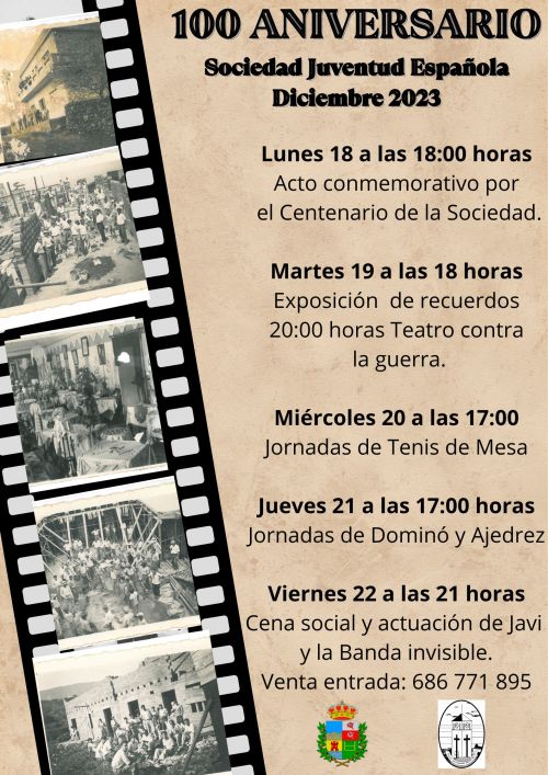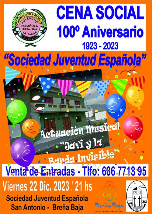 Con motivo del 100º Aniversario de la Sociedad de Instrucción y Recreo “Juventud Española” de San Antonio (1923 - 2023) del 18 al 22 de diciembre tendrá lugar una serie de actos en la misma Sociedad que están promovidos por el Ayuntamiento de Breña Baja y que cuenta con el apoyo de la Asociación de Vecinos “Antomara” y varios colaboradores.
