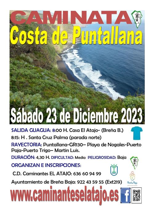 El sábado 23 de diciembre, el C. D. de Caminantes "El Atajo" y la Concejalía de Deportes del Ayuntamiento de Breña Baja organizan, dentro del Programa de Senderismo de Breña Baja, la caminata nº 855 "Costa de Puntallana".