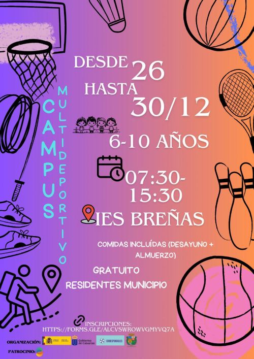 La Concejalía de Bienestar Social del Ayuntamiento de Breña Baja organiza un “Campus Multideportivo por Navidad”, para facilitar la conciliación de las familias del municipio, durante este periodo vacacional. Tendrá lugar del 26 al 30 de diciembre, en el IES “Las Breñas”. Dirigido a niños y niñas de 6 a 10 años.