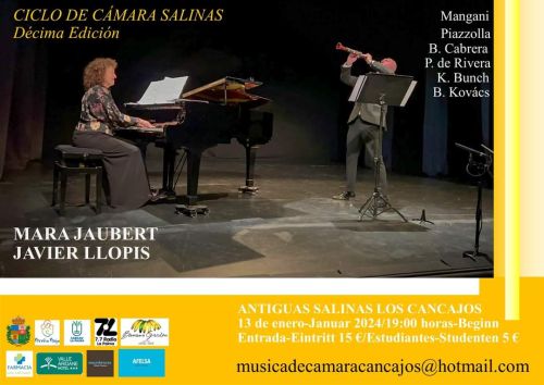 Comienza la Décima Edición del Ciclo de Cámara Salinas en Las Antiguas Salinas de Los Cancajos. El 13 de enero, 19 hs, con Mara Jaubert y Javier Llopis que interpretarán un repertorio centrado en la música de P. de Rivera, Kóvacs, Bunch, Piazzolla, Mangani y otros.