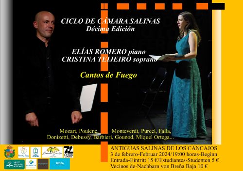 El sábado 3 de febrero a las 19 hs, en las Antiguas Salinas de Los Cancajos tendrá lugar el tercer concierto del Ciclo de Cámara Salinas en su décima edición, “Cantos de Fuego” con Cristina Teijeiro (soprano) y Elías Romero (piano).