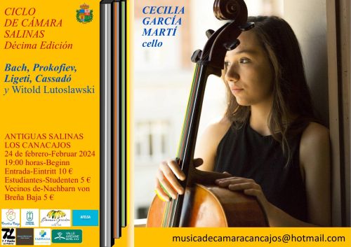 El sábado 24 de febrero a las 19 hs, tendrá lugar el cuarto concierto de la Décima Edición del Ciclo de Cámara Salinas en Las Antiguas Salinas de Los Cancajos, con la actuación de Cecilia García Martí al violonchelo.
