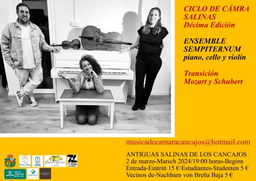 El sábado 2 de marzo a las 19 hs, tendrá lugar el quinto concierto de la Décima Edición del Ciclo de Cámara Salinas en Las Antiguas Salinas de Los Cancajos, con la actuación del trío Ensemble Sempiternum (violonchelo, piano y violín), que interpretará un repertorio centrado en Mozart y Schubert.