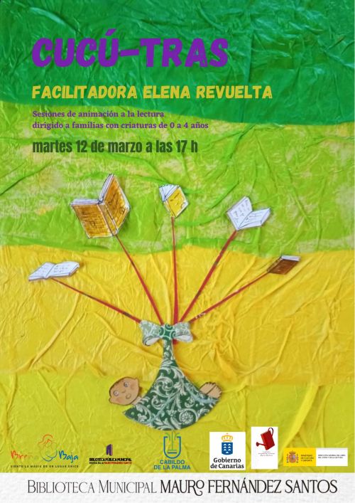 - “Cucú-Tras” (0-4 años), el martes 12 de marzo a las 17 hs y facilitado y dinamizado por Elena Revuelta. Una bebeteca de 0 a 4 años, y para sus madres y padres. Un espacio de diversión con libros, poemas, canciones, ilustraciones…Un lugar para mostrar y descubrir estrategias a los padres igual que el propio “Cucú-tras” nos hace escondernos y aparecer de forma mágica detrás de nuestras manos. Para jugar, contar y cantar.
