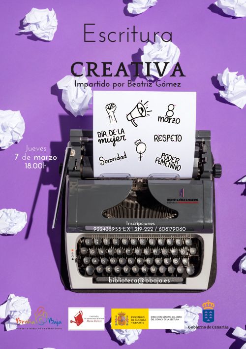 - “Escritura Creativa” (13-18 años), el jueves 7 de marzo a las 18 hs, por parte de Beatriz Gómez. A través de diversas estrategias desarrollaremos la creatividad en su máxima extensión, exteriorizando la imaginación, expresando nuestras ideas y compartiendo nuestra emociones. Con juegos y ejemplos utilizando las más modernas técnicas pedagógicas que fomentan la lectura y la escritura desde un prisma original en el que cada participante pueda desarrollar sus capacidades sin que se sienta encorsetado por la teoría.