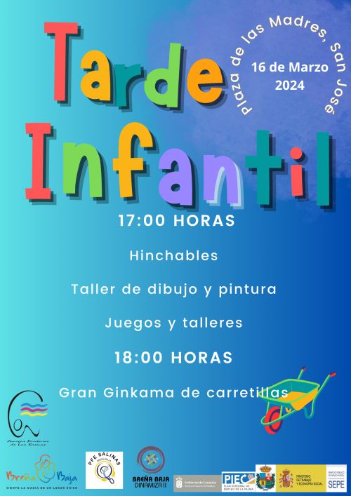 - Sábado 16 de Marzo, 17,00 h, TARDE INFANTIL con Hinchables (Tabayzú), Taller de Dibujo y Pintura (“Amigos Pintores de Las Breñas”) y Juegos y Talleres (PFE “Breña Baja Dinamiza II”). También se cuenta con la colaboración del PFE “Salinas”.