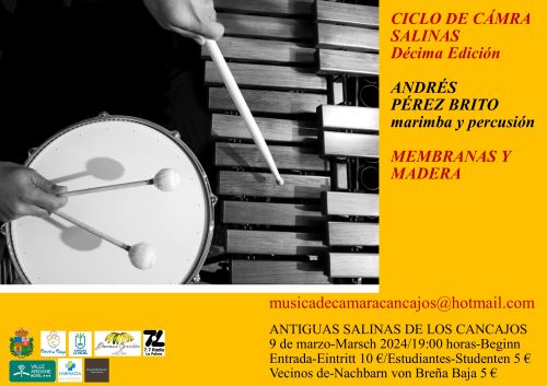 El sábado 9 de marzo a las 19 hs, tendrá lugar el sexto concierto de la Décima Edición del Ciclo de Cámara Salinas en Las Antiguas Salinas de Los Cancajos, con la actuación de Andrés Pérez Brito con el concierto de marimba y percusión “Membranas y Madera”.