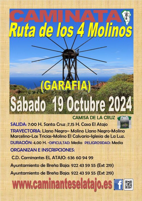 El sábado 19 de octubre, el C. D. de Caminantes "El Atajo" y la Concejalía de Deportes del Ayuntamiento de Breña Baja organizan, dentro del Programa de Senderismo de Breña Baja, la caminata nº 901 "Ruta de los 4 Molinos", en el municipio de la Villa de Garafía.