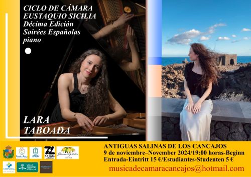 El sábado 9 de noviembre, 19 hs, tendrá lugar el quinto concierto de la décima edición del Ciclo de Cámara “Eustaquio Sicilia” en las Antiguas Salinas de Los Cancajos, con Lara Taboada (piano), bajo el título de “Soirées españolas”, un repertorio con obras de Chopin en su mayor parte.