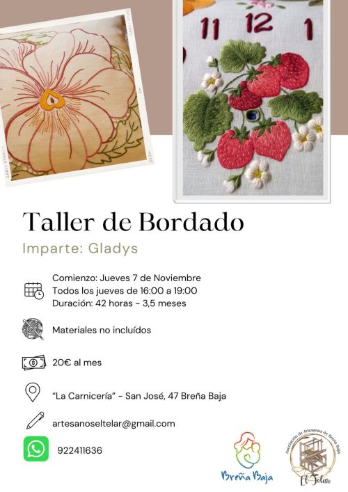 La Asociación de Artesanos "El Telar" de Breña Baja y la Concejalía de Artesanía del Ayuntamiento de Breña Baja organiza un taller de Bordado en el Centro de Artesanía “La Carnicería” en San José. Plazas limitadas.