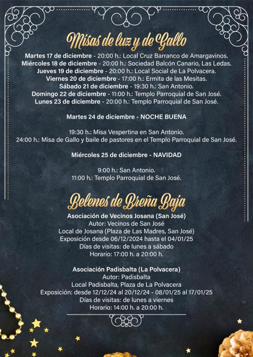 Previamente, el viernes 29 de noviembre se celebra el Encendido Navideño en el CEIP San Antonio. Asi mismo desde el martes 17 de diciembre comienzan las Misas de Luz, preparadas por las Comunidades Parroquiales de San José y San Antonio hasta la Noche Buena del 24 de diciembre, con el nacimiento del Niño Jesús. Habrán en exposición pública dos Belenes, por parte de la asociación de vecinos “Josana” de San José y la asociación “Padisbalta” en La Polvacera.