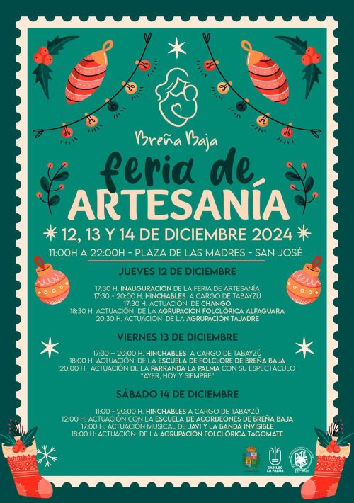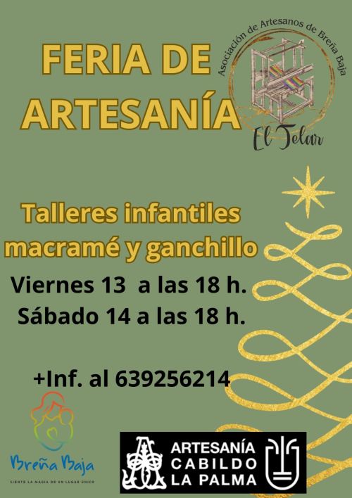 Del 12 al 14 de diciembre en la Plaza de Las Madres de San José tendrá lugar la “Feria de Artesanía” que organiza el Ayuntamiento de Breña Baja, conjuntamente con la asociación artesanal “El Telar” de Breña Baja, por estas fechas navideñas. Cuenta con la colaboración de la Consejería de Artesanía del Cabildo Insular de La Palma.