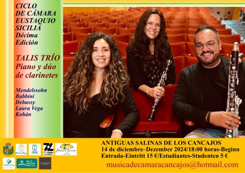 El sábado 14 de diciembre, 19 hs tendrá lugar el octavo concierto de la décima edición del Ciclo de Cámara “Eustaquio Sicilia” en las Antiguas Salinas de Los Cancajos, con el Talis Trío, integrado por Noemí Salomón (Piano) Laura Sanchez (Clarinete) y Samuel Hernández (Clarinete).