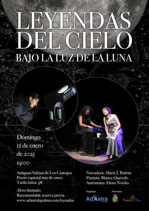 Ad Astra La Palma y el Ayuntamiento de Breña Baja organizan para el domingo 12 de enero, 19 hs, “Leyendas del Cielo bajo la Luz de la Luna” en las Antiguas Salinas de Los Cancajos. Donde los asistentes, descubrirán un verdadero deleite para los sentidos y el alma de la mano de una narradora oral, una pianista y una astrónoma.