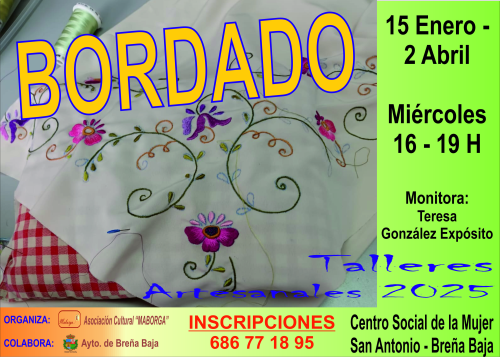 La asociación cultural “Maborga” pone en marcha las inscripciones para el Taller de “Bordado” en el Centro Social de la Mujer “Efigenia Pérez Concepción” en San Antonio que se desarrolla del 15 de enero al 2 de abril. Colabora la Concejalía de Artesanía del Ayuntamiento de Breña Baja.