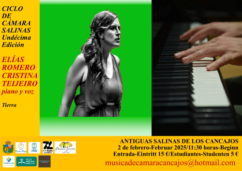 El domingo 2 de febrero a las 11.30 hs, tendrá lugar el cuarto concierto de la Undécima Edición del Ciclo de Cámara “Salinas” en Las Antiguas Salinas de Los Cancajos, con la actuación de Elías Romero y Cristina Teijeiro, nos ofrecerán un repertorio con obras centradas en la temática de la tierra.