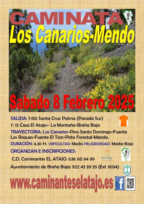 El sábado 8 de febrero, el C. D. de Caminantes "El Atajo" y la Concejalía de Deportes del Ayuntamiento de Breña Baja organizan, dentro del Programa de Senderismo de Breña Baja, la caminata nº 917 "Los Canarios - Mendo", entre los municipios de Fuencaliente y El Paso.