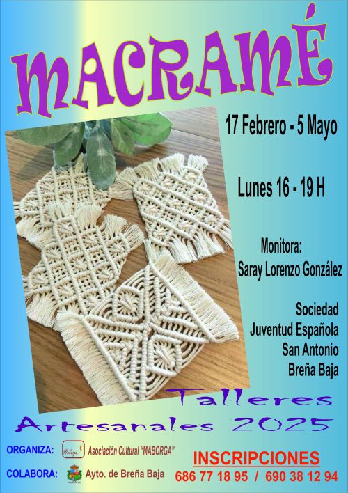 La asociación cultural “Maborga” pone en marcha las inscripciones para el Taller de “Macramé” en la Sociedad Juventud Española de San Antonio que se desarrolla del 17 de febrero al 5 de mayo. Colabora la Concejalía de Artesanía del Ayuntamiento de Breña Baja.