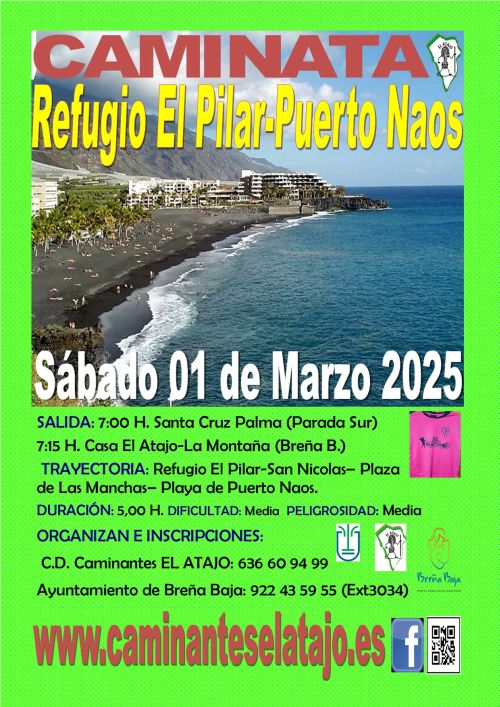 El sábado 1 de marzo, el C. D. de Caminantes "El Atajo" y la Concejalía de Deportes del Ayuntamiento de Breña Baja organizan, dentro del Programa de Senderismo de Breña Baja, la caminata nº 920 "Refugio El Pilar - Puerto Naos" en el municipio de Los Llanos de Aridane.