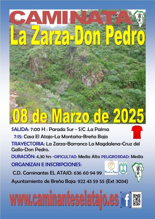 El sábado 8 de marzo, el C. D. de Caminantes "El Atajo" y la Concejalía de Deportes del Ayuntamiento de Breña Baja organizan, dentro del Programa de Senderismo de Breña Baja, la caminata nº 921 "La Zarza - Don Pedro" en el municipio de la Villa de Garafía.