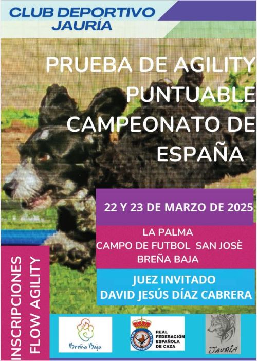 El sábado 22 de marzo a las 16 hs en el Estadio Municipal de Breña Baja (San José) tendrá lugar la apertura de la prueba puntuable Campeonato de España (Agility). Continuara el domingo 23 a las 9 hs y la entrega de trofeos esta prevista para las 13 hs.